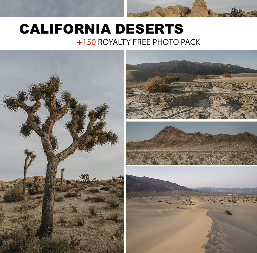 This pack contains a very special set of different California deserts: dunes, mountains in different daylight, many rocks with multiple shapes and sizes, textures in the sand, and typical desert vegetation.